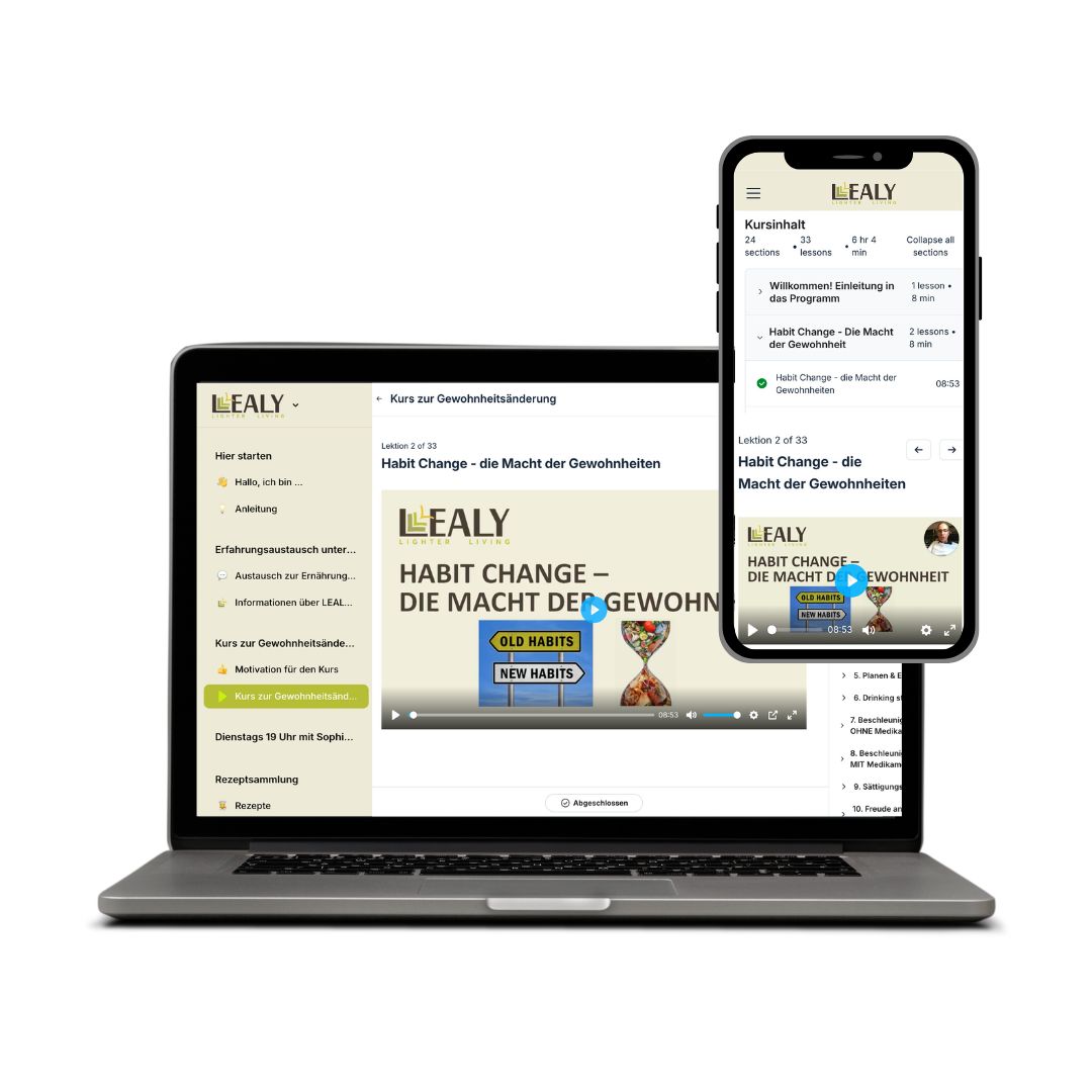 LEALY begleitet dich digital und gleichzeitig sehr persönlich. Über unsere App erhältst du Zugang zu Lerninhalten, praktischen Übungen, Rezepten und einer wachsenden Wissensdatenbank. Zusätzlich bist du eingebettet in eine große Community, wirst von Coaches und Expertinnen begleitet und kannst dich in Gruppenmeetings austauschen. So hast du immer Rückhalt – digital flexibel, aber nie allein.